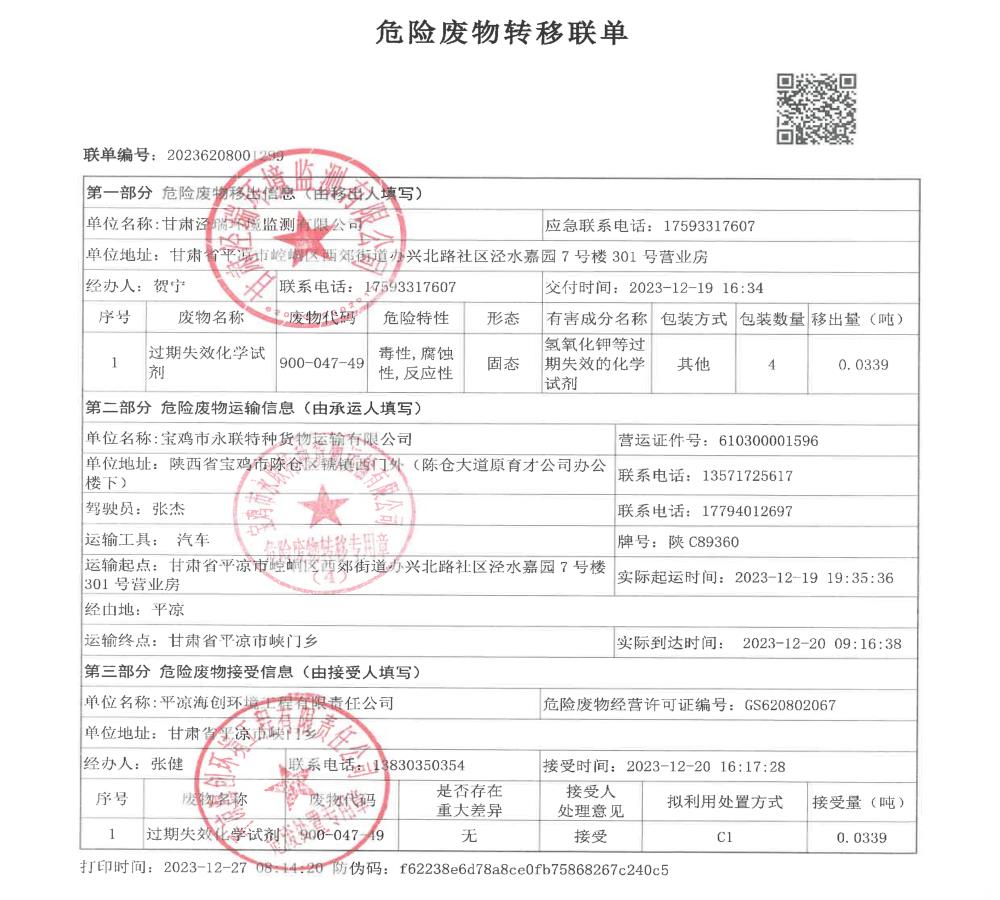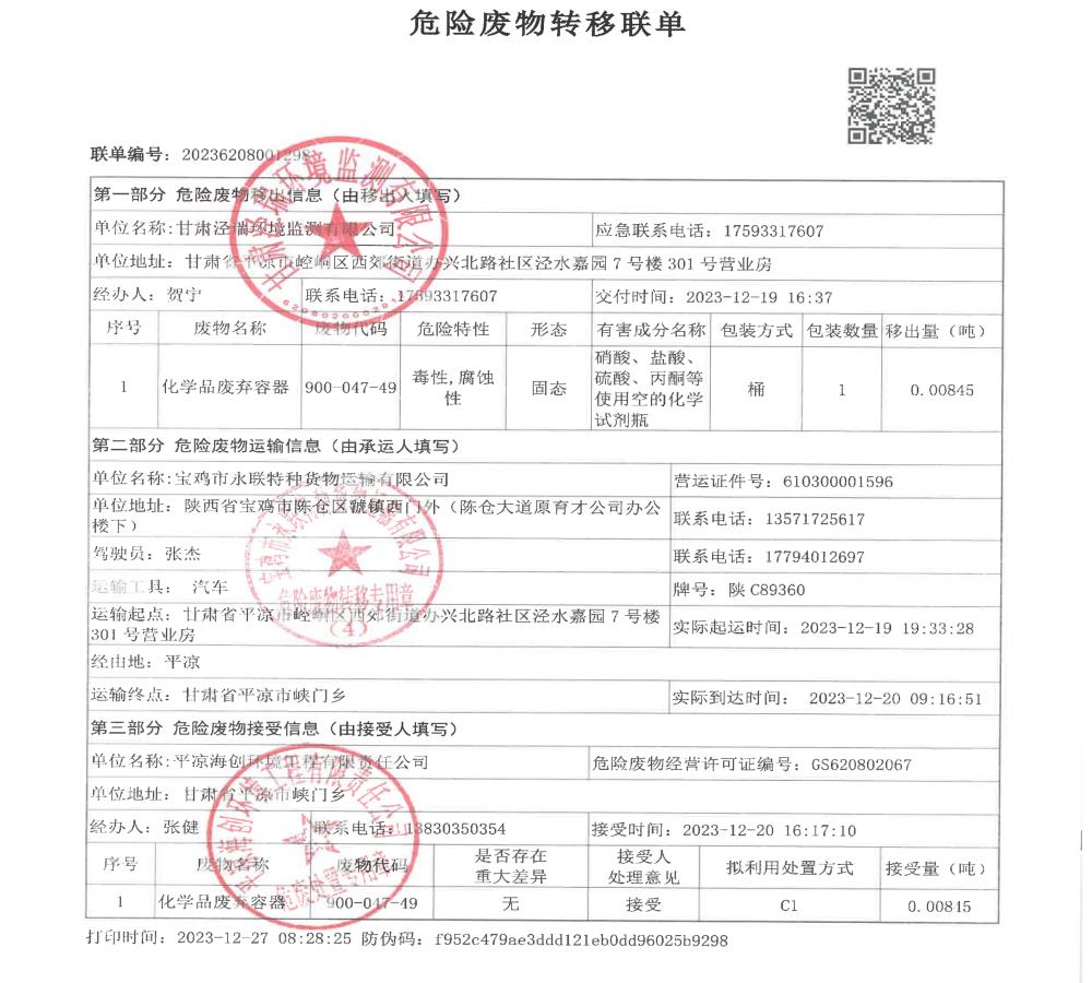 根據(jù)《中華人民共和國固體廢物污染環(huán)境防治法》(2020年9月1日修訂)的相關(guān)規(guī)定,甘肅涇瑞環(huán)境監(jiān)測有限公司依法及時公開固體廢物污染環(huán)境防治信息,主動接受社會監(jiān)督。